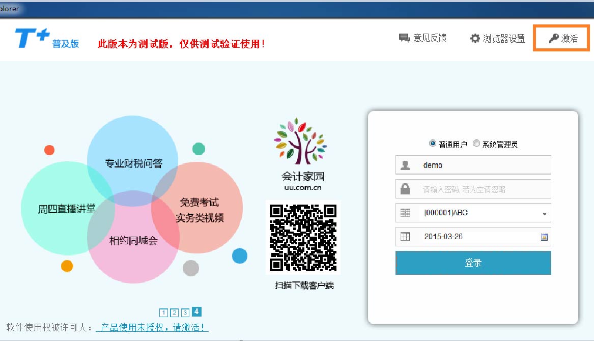 进入T+普及版登录界面,点击左上角的“激活”链接