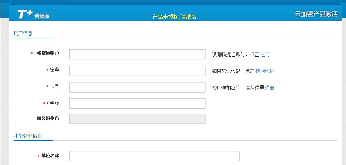 畅捷通帐号验证通过后,打开产品包装盒。找到云加密卡,将您获得的产品卡号和CDKey输入页面相应的输入框中。待系统验证卡号和CDKey后,并自动带入以下信息: